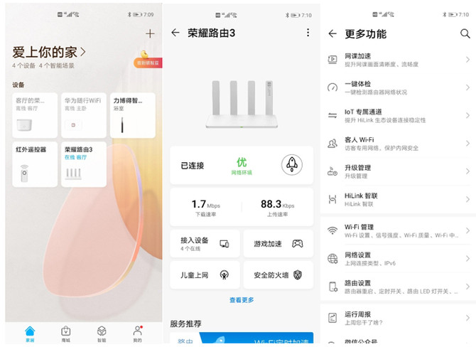 除了儿童上网保护外,还有针对学生上网课的专项加速,IoT专用通道,客人Wi-Fi等贴心的应用,让荣耀路由3成为您家庭智能而强大的管理中心。